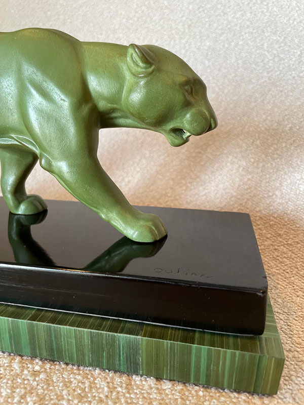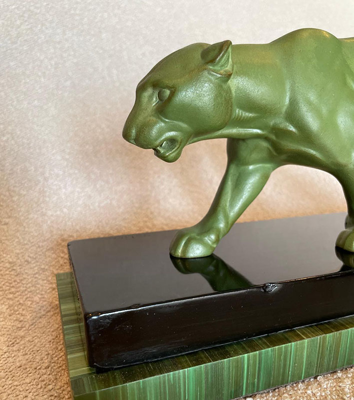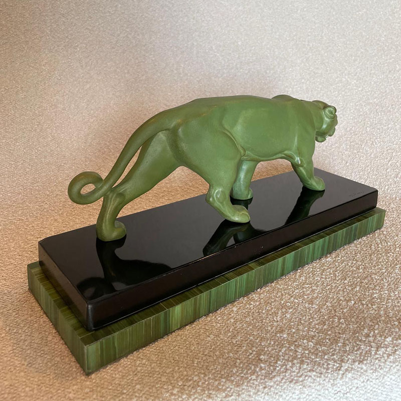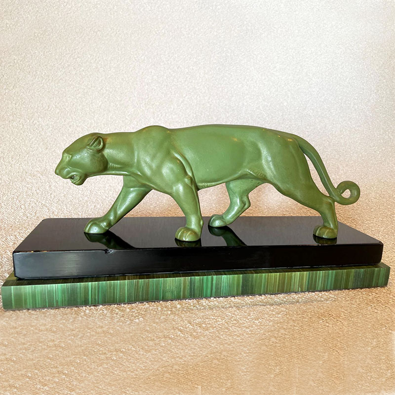 Escultura de pantera caminando sobre mármol negro con bella pátina bronce oxidado, firmada a punzón  "Ouline" sobre el mármol. Francia, años 30´.
