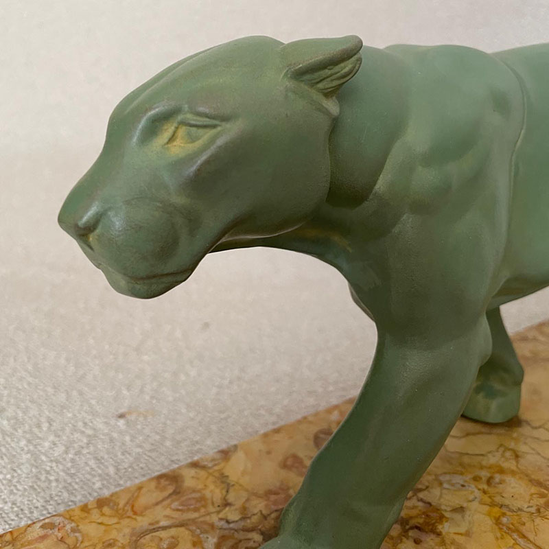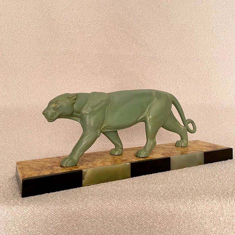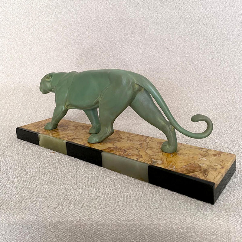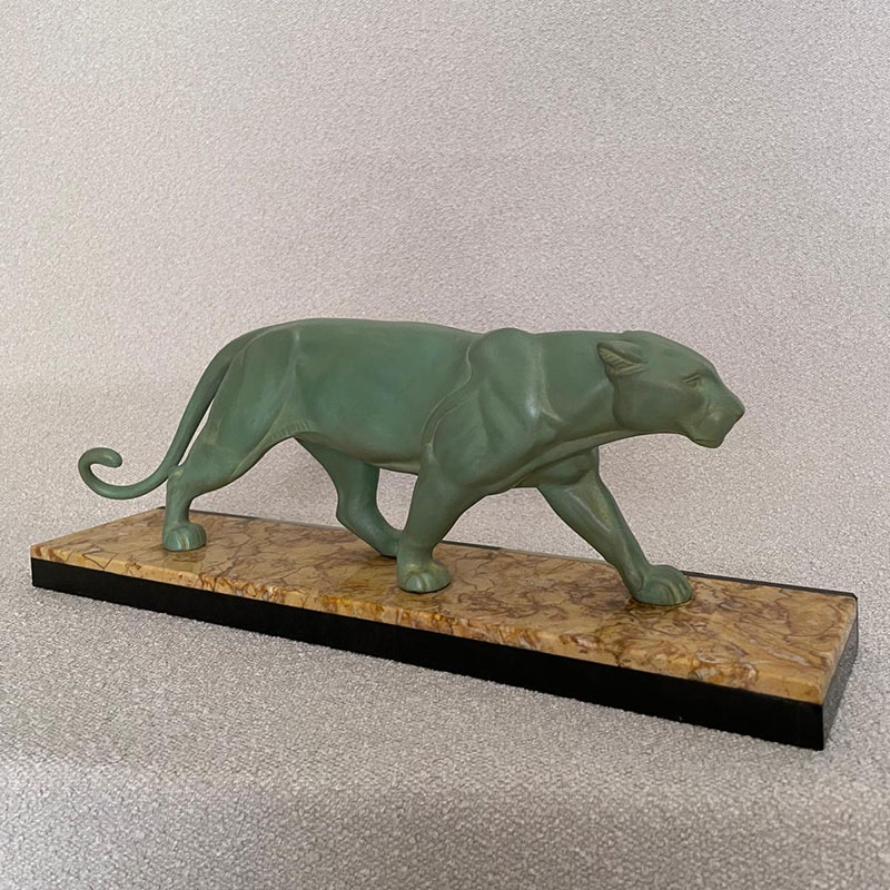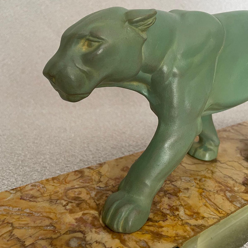 Escultura Art Deco de gran formato representando una pantera marchando, de A. Ouline en metal patinado en frio sobre peana de marmol y ónix. Francia, años 30.