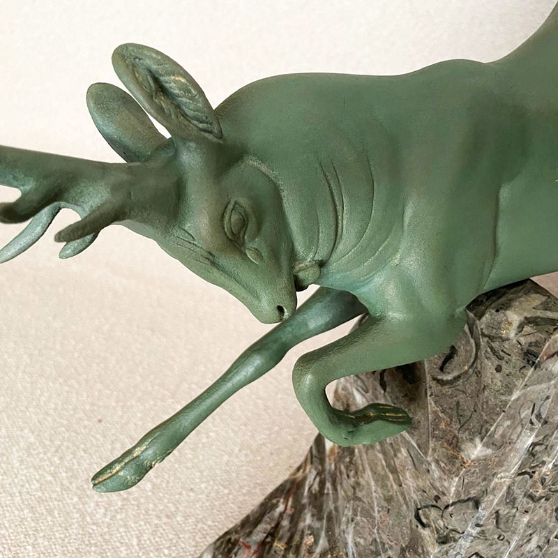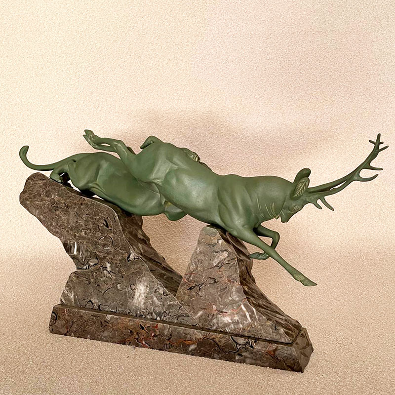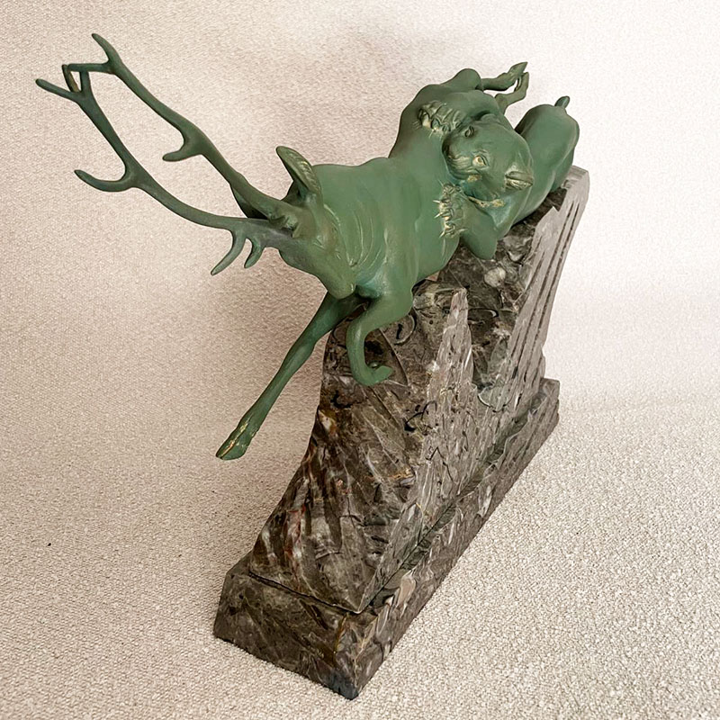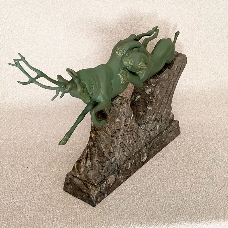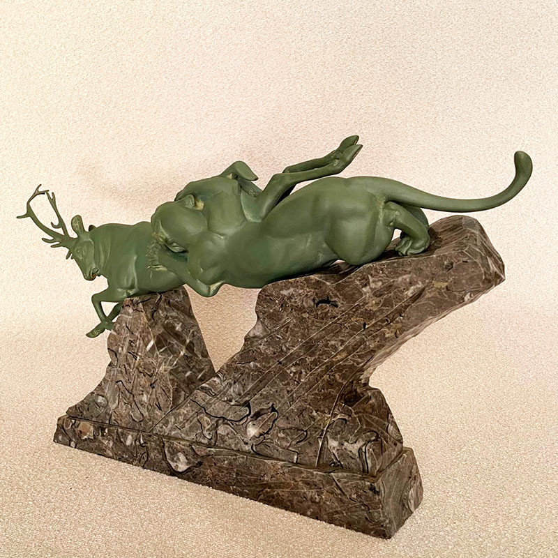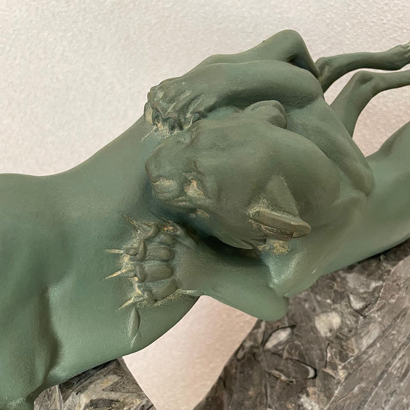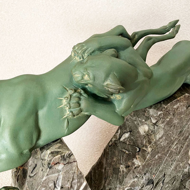 Gran conjunto escultórico repesentando a un jaguar en pleno ataque a una presa, en metal patinado sobre peana de mármol. Francia, años 30.