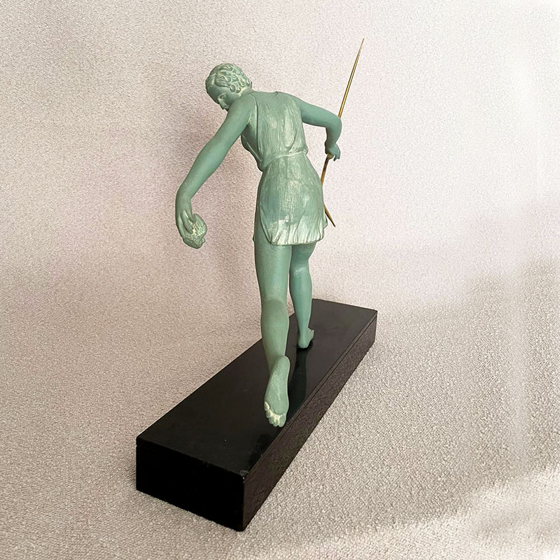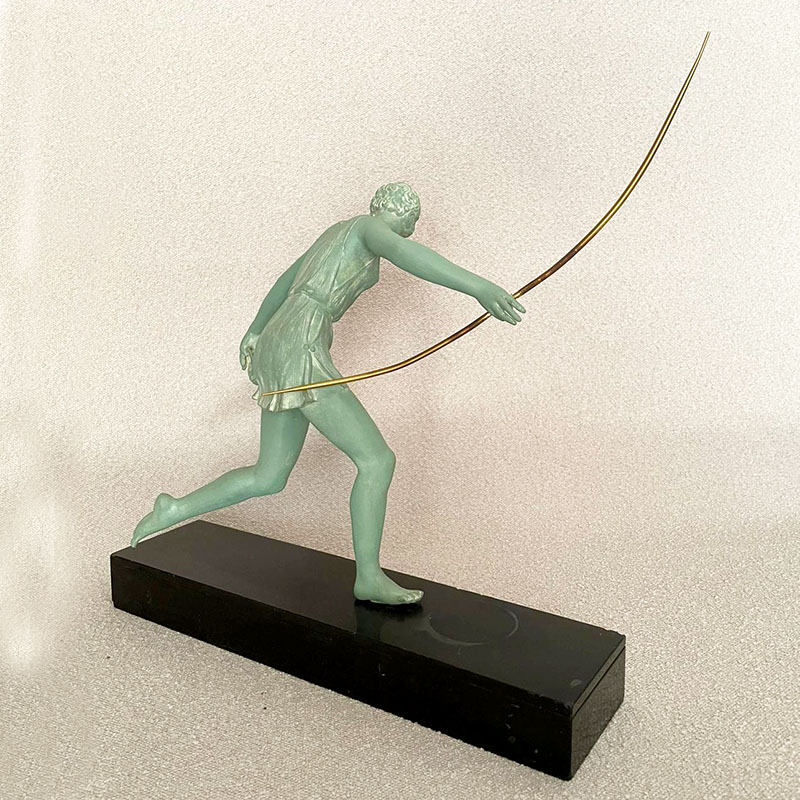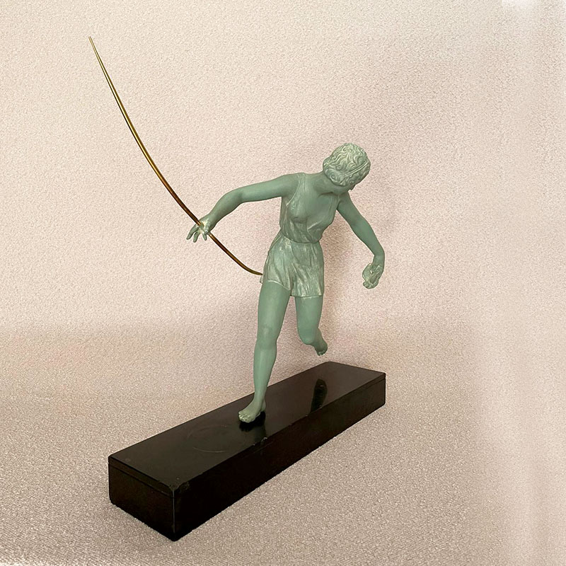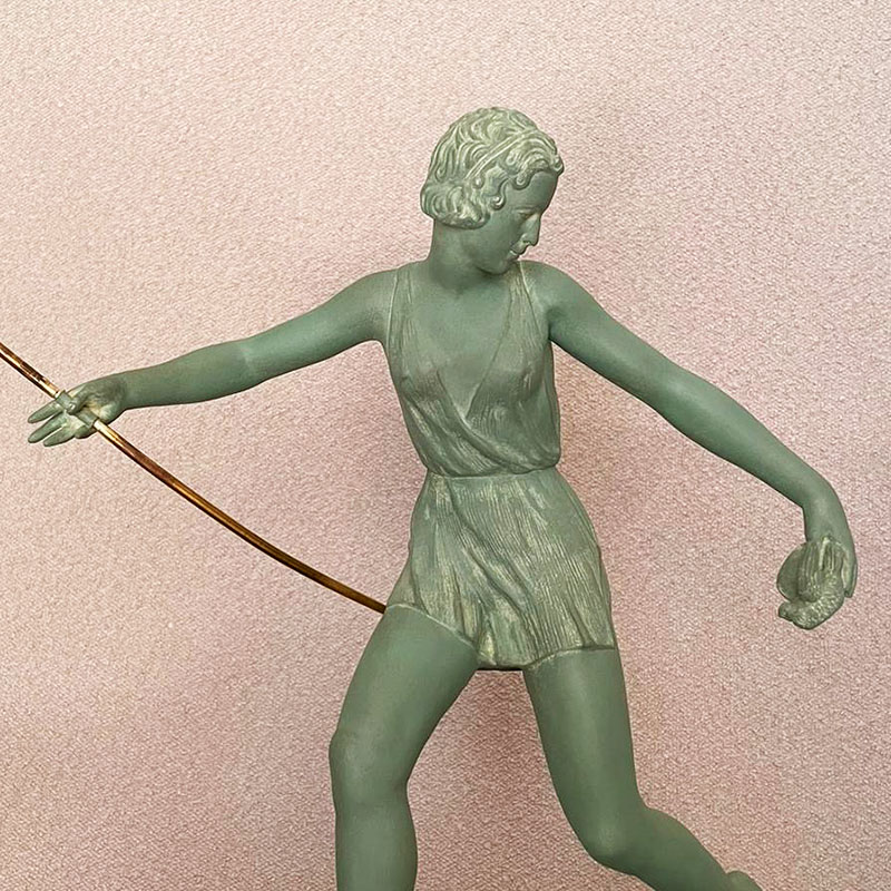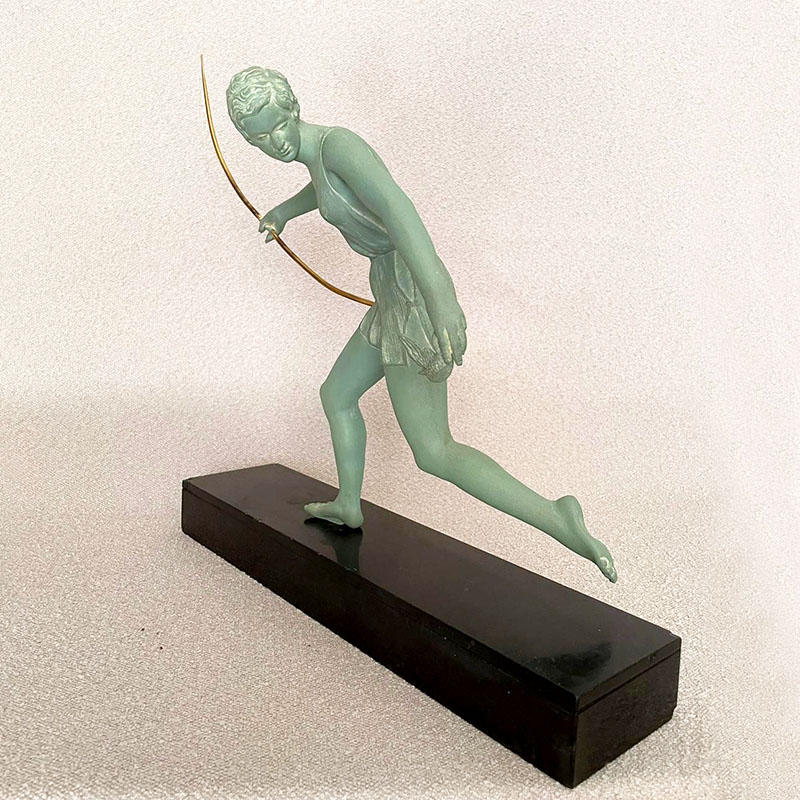 Escultura Art Deco representando a la Diosa Diana cazando un pájaro con su arco, figura de gran movimiento y bella pátina sobre base de mármol negro belga, firmada Nitche a punzón. Francia, años 30.