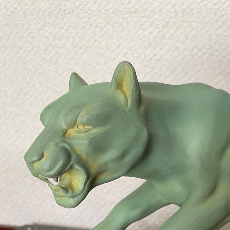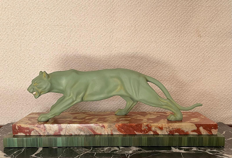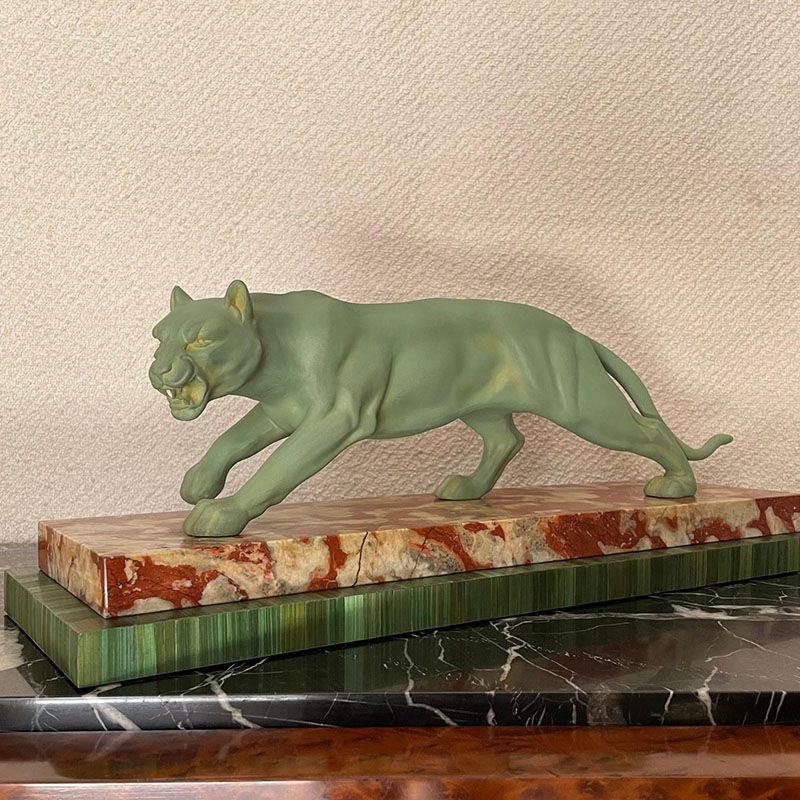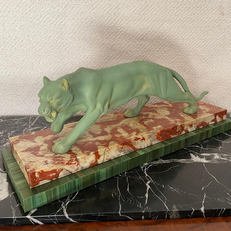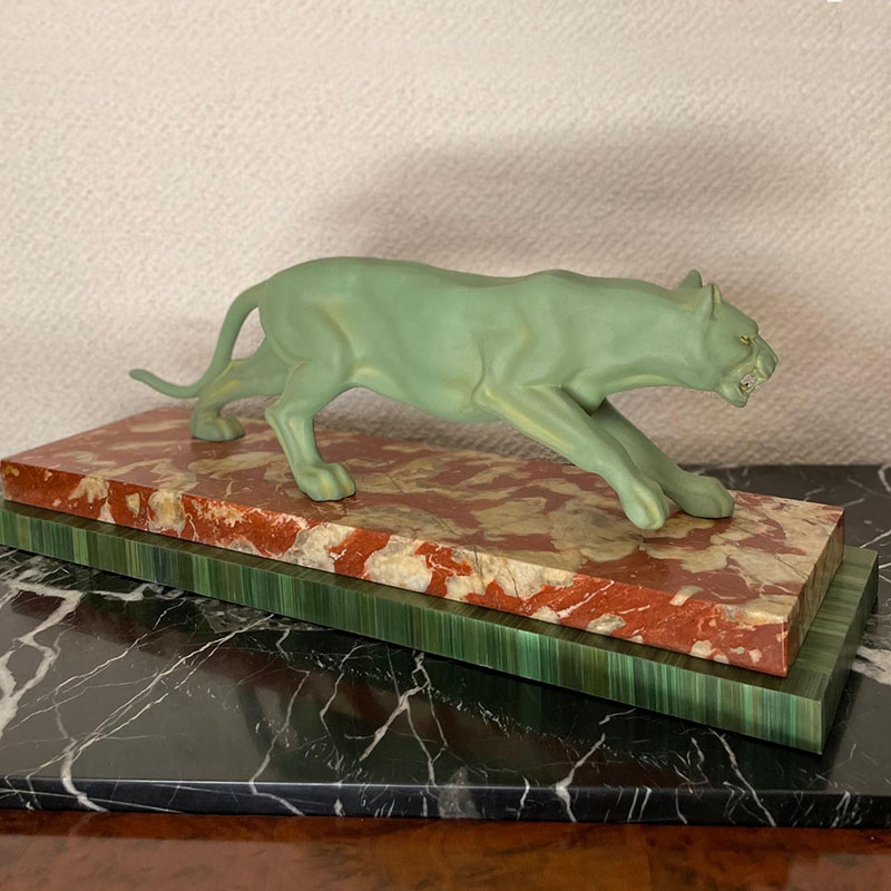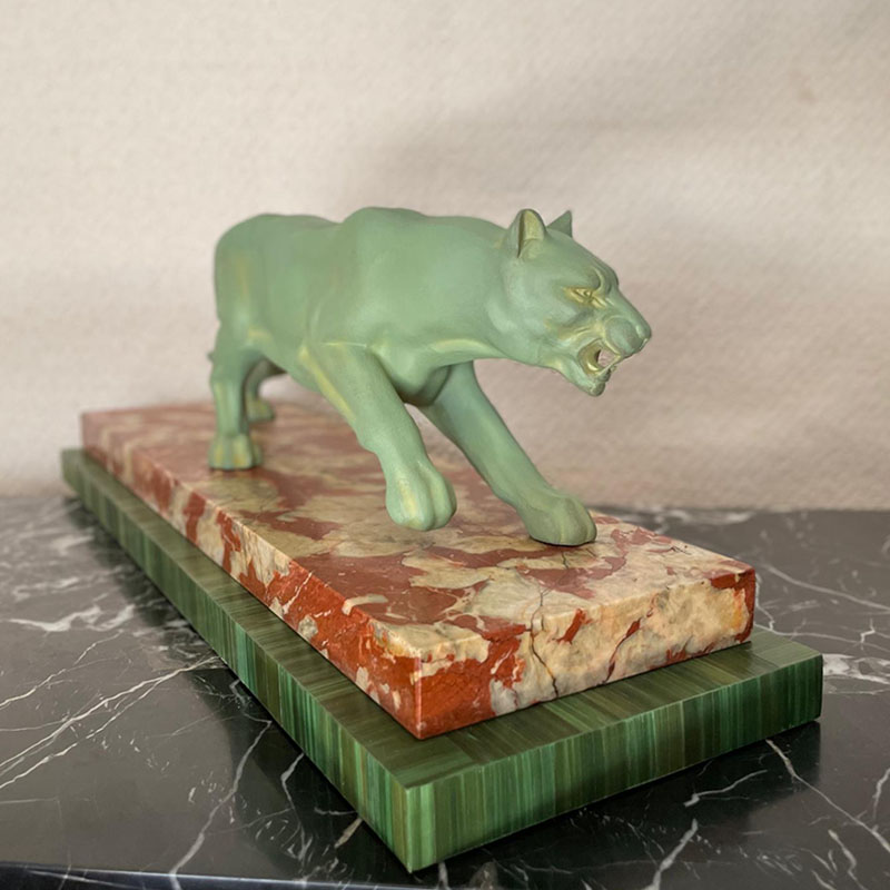 Escultura art Deco representando una pantera en modo de ataque, bella pátina oxido bronce sobre mármol , atribuida a Rochard. Francia, años 30´
