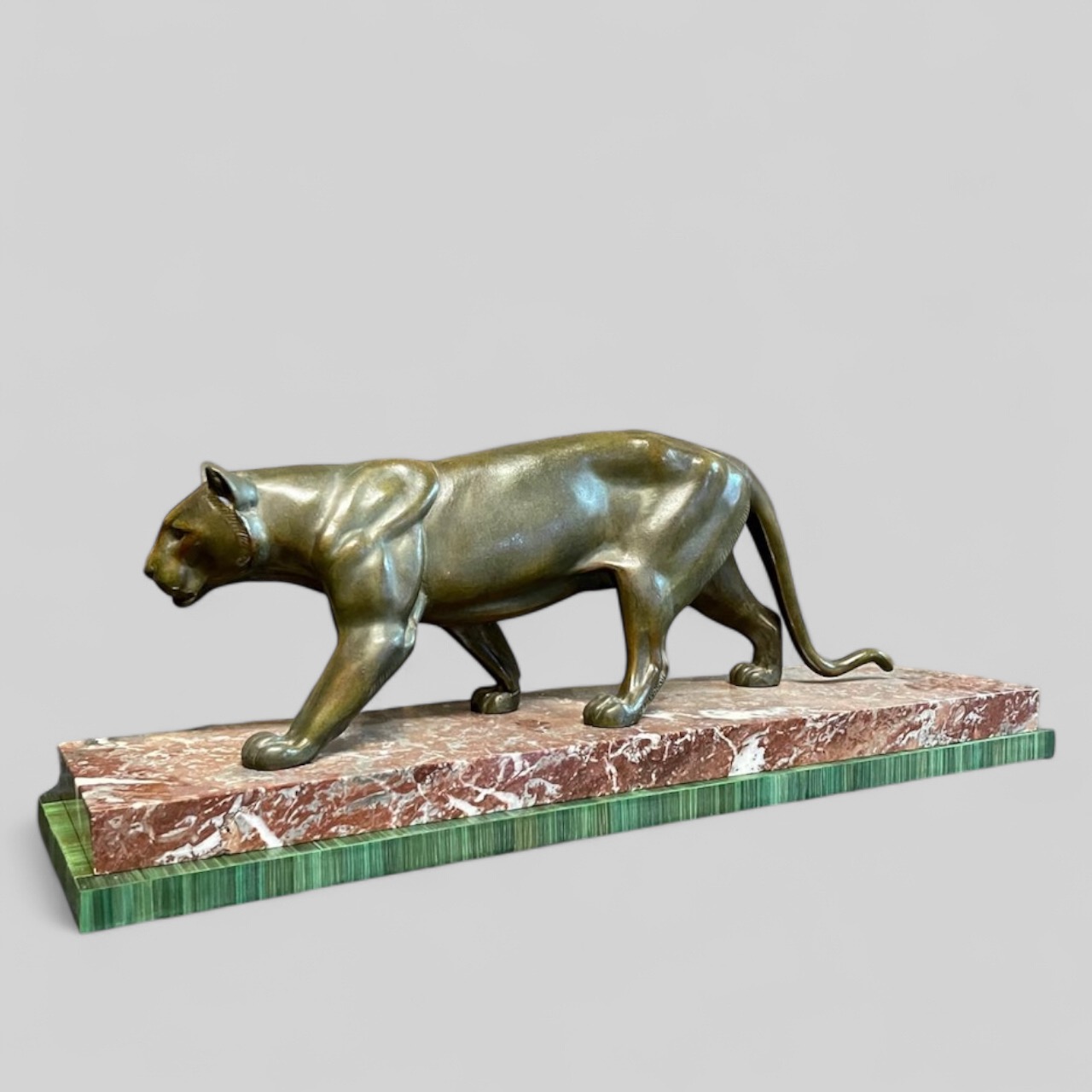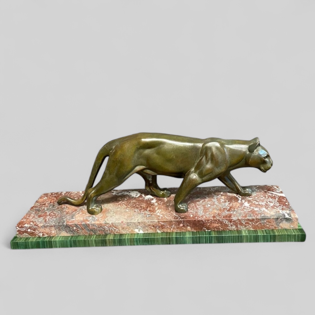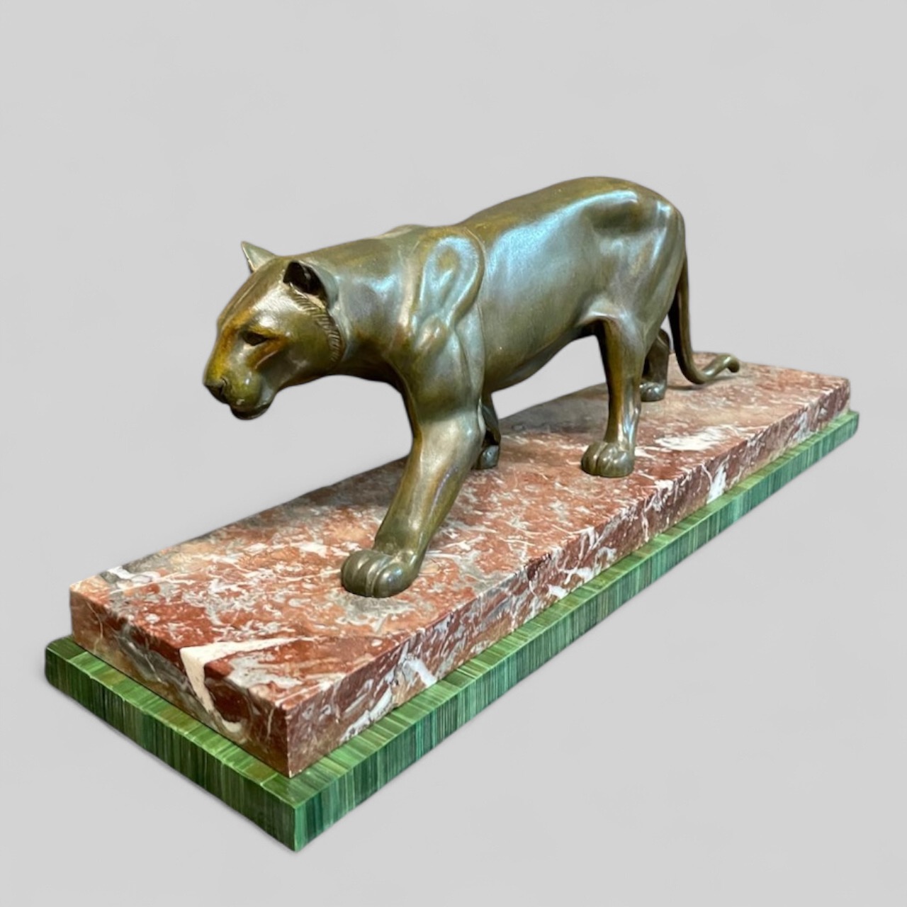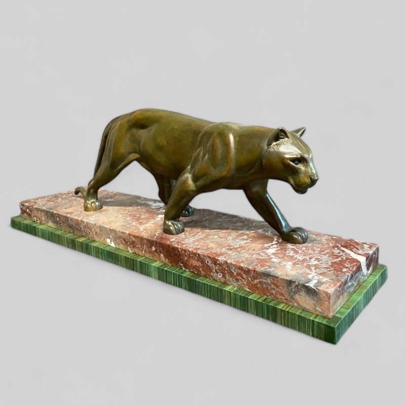 Gran pantera Art Deco en metal patinado y base de mármol, firmada Leduc. Francia, años 30’.