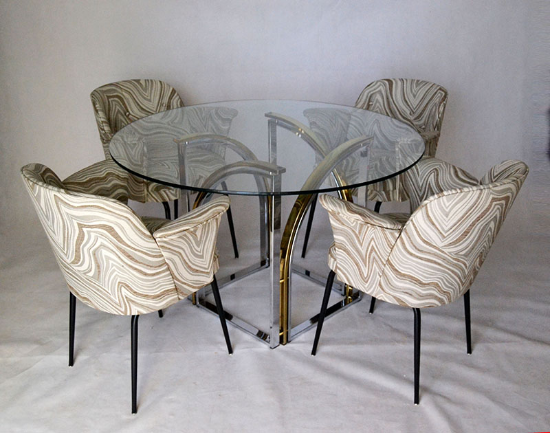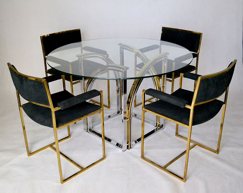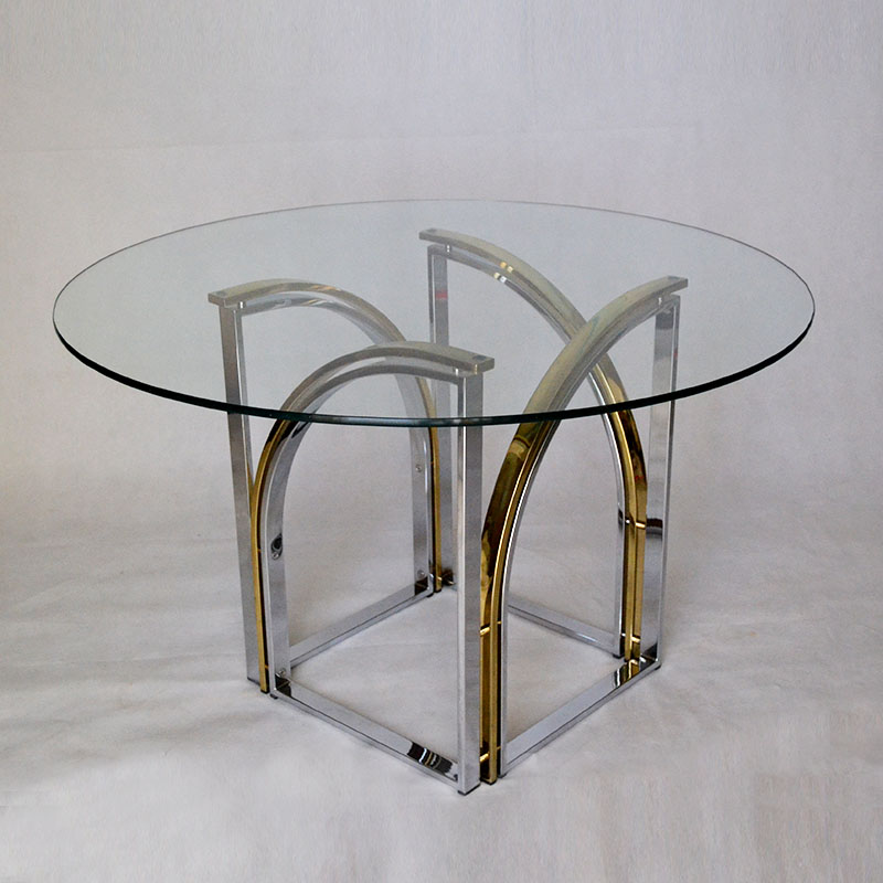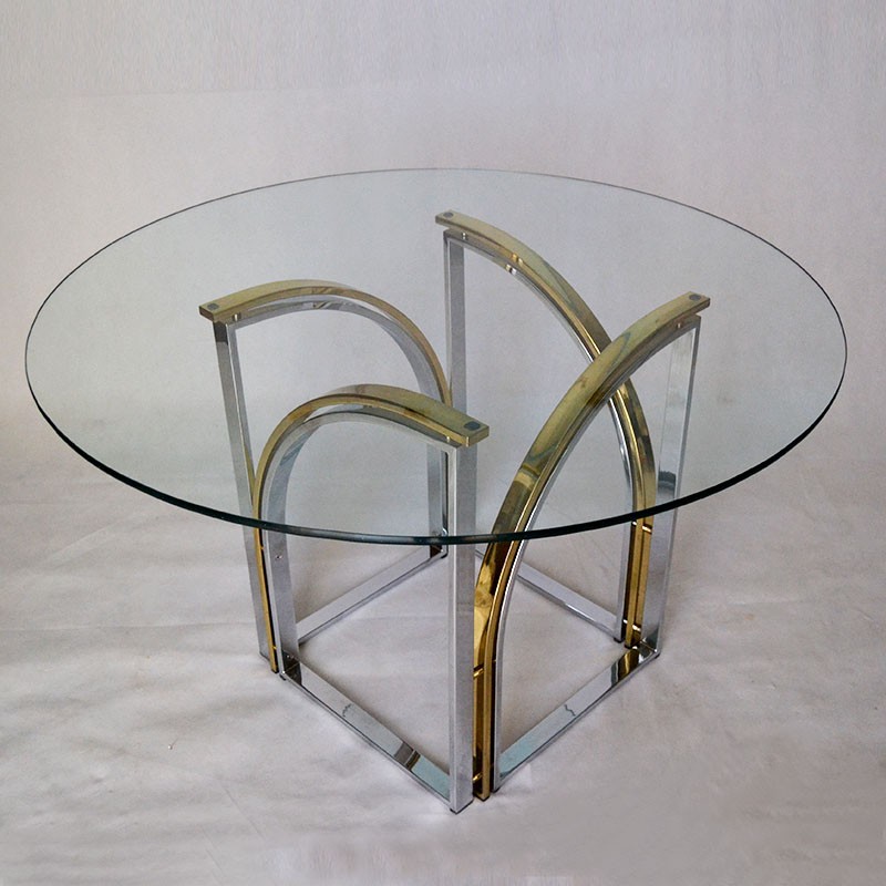 Mesa en metal cromado y dorado con tapa de cristal. Italia . Años 70.