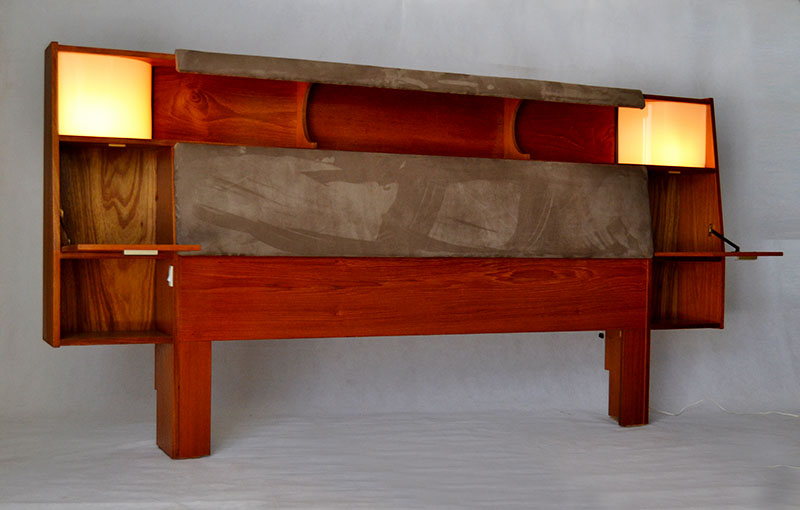 Cabecero en madera de teca y cuero nobuck con apliques de luz. Dinamarca. Años 60.