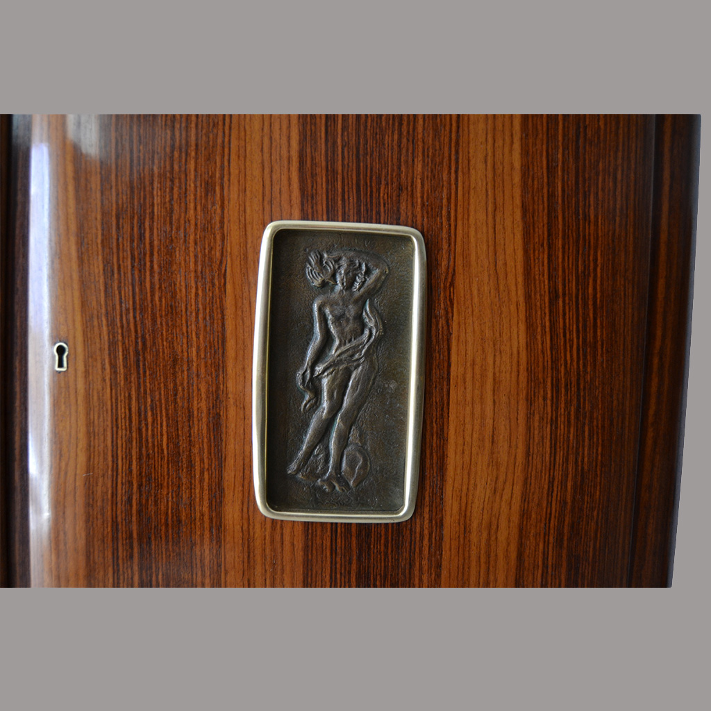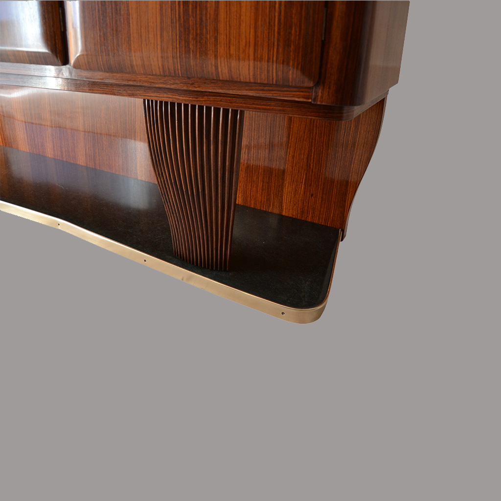 Buffet Gabinete bar diseño de Vittorio Dassi, en palisandro y mármol verde con relieves en bronce, tapa de cristal. Italia años 50