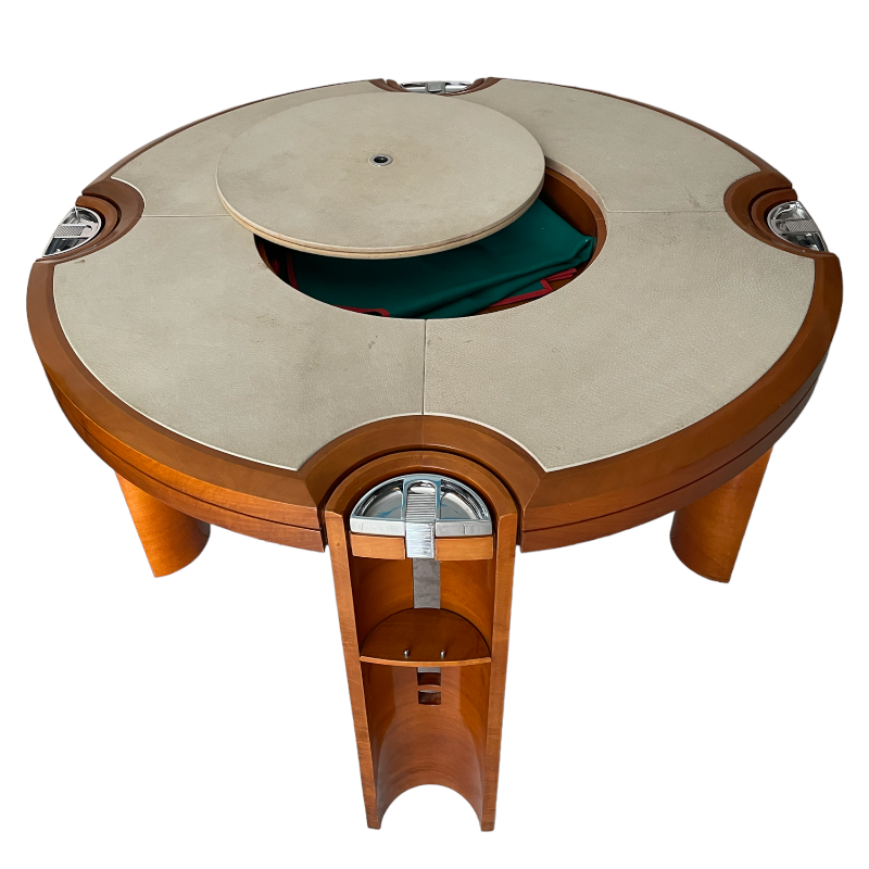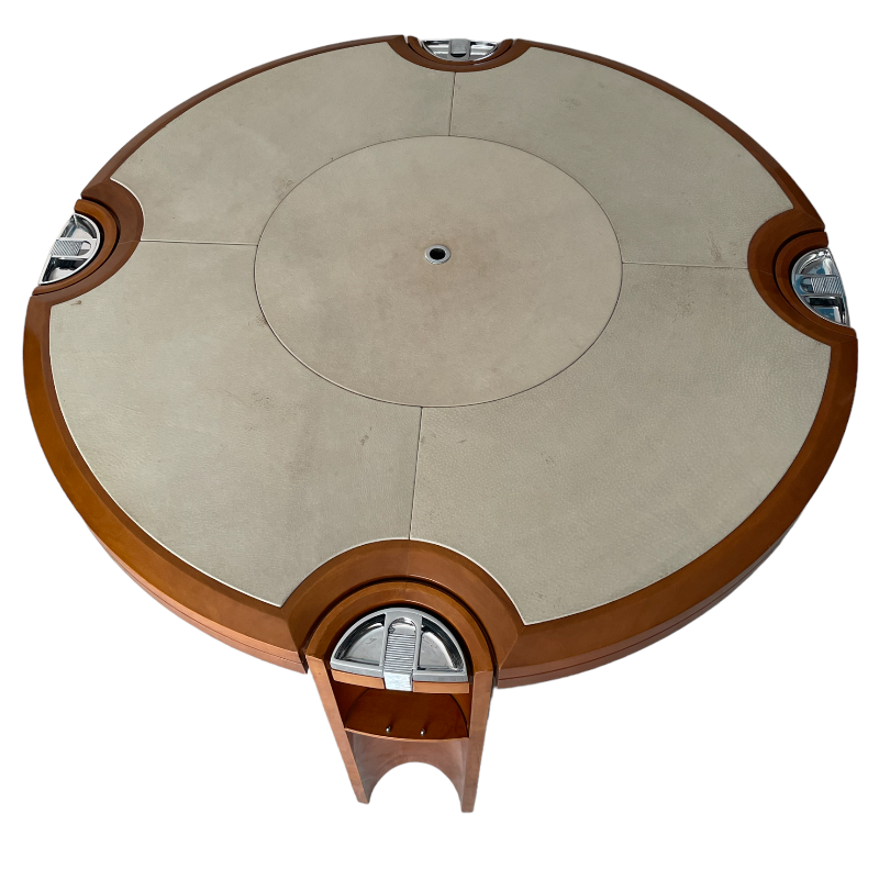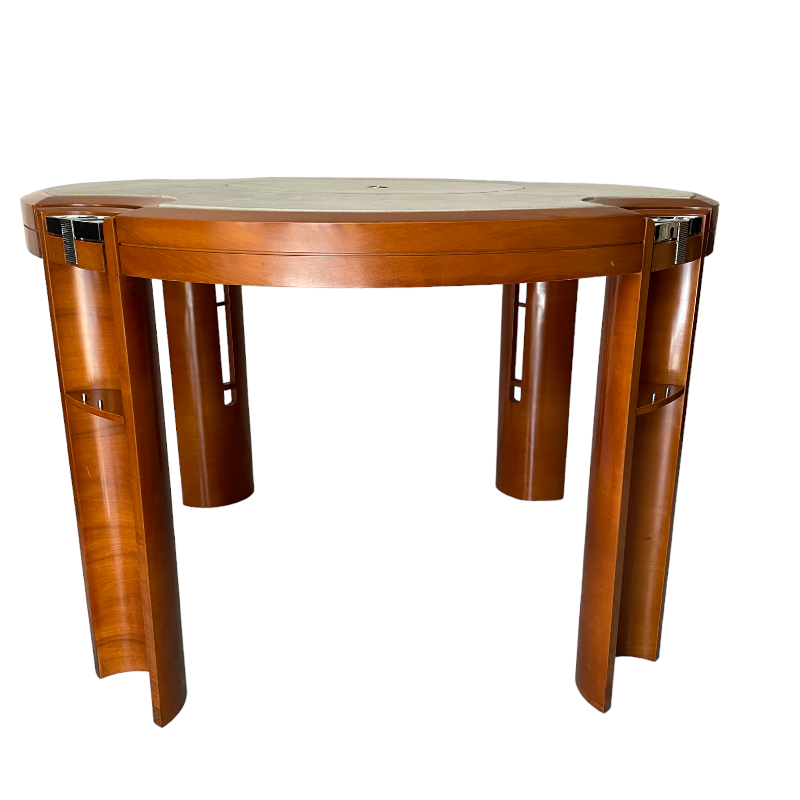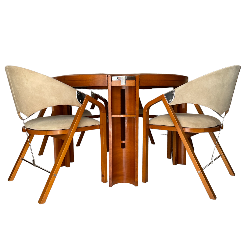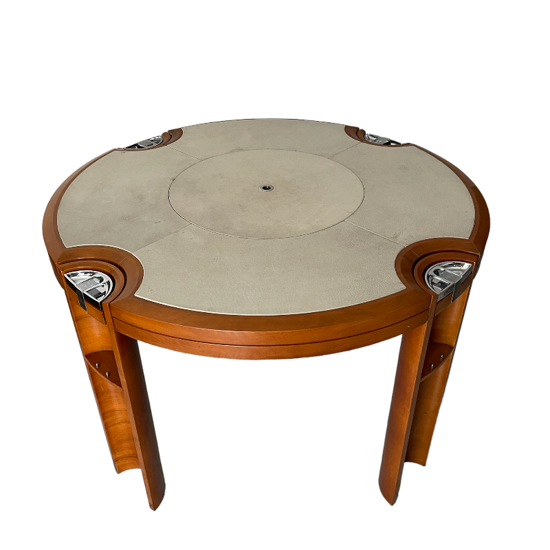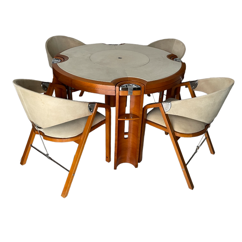 Conjunto Jocker de Jaume Tresserra, mesa de juego en madera cerezo y piel pekari y cuatro sillones en madera, metales cromados y tapicería en piel pekari. España, años 90’.