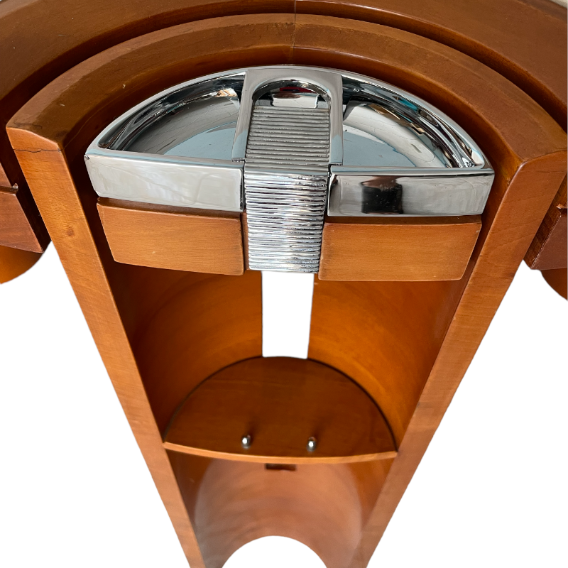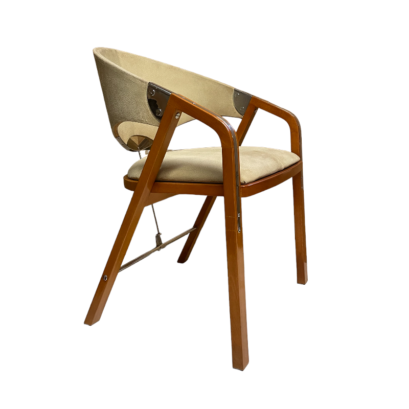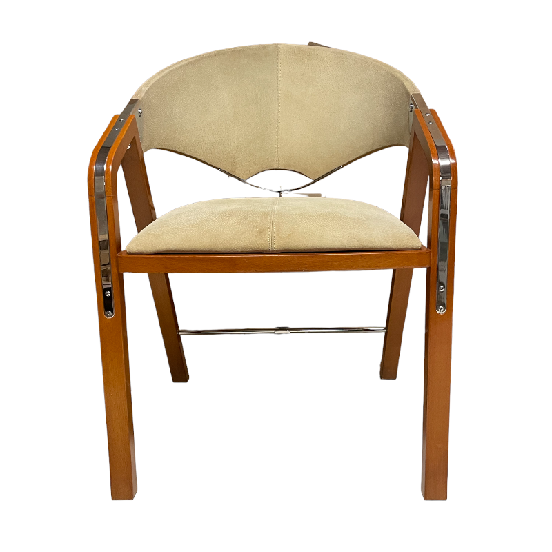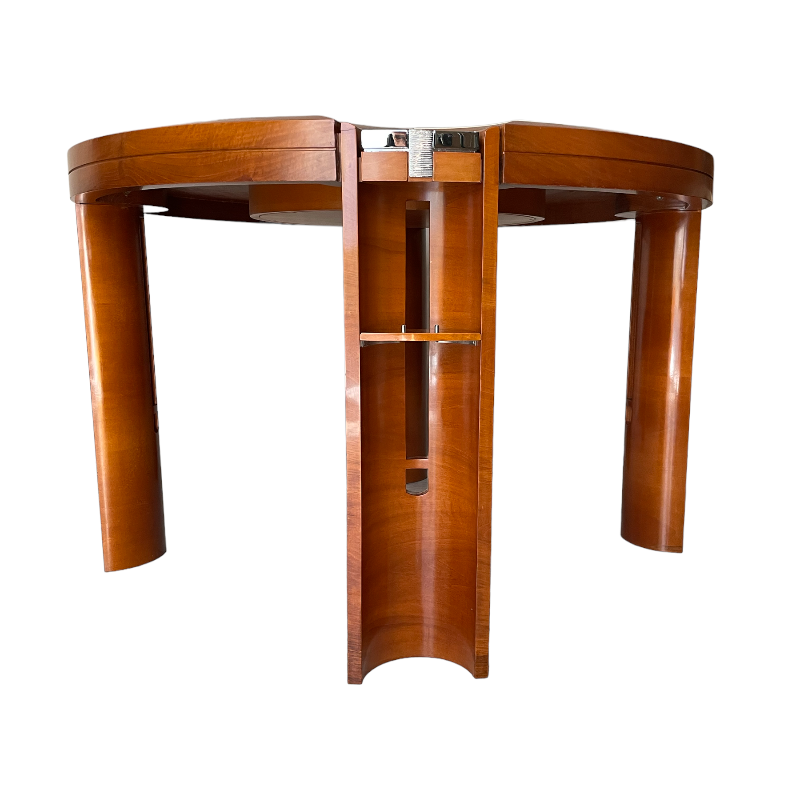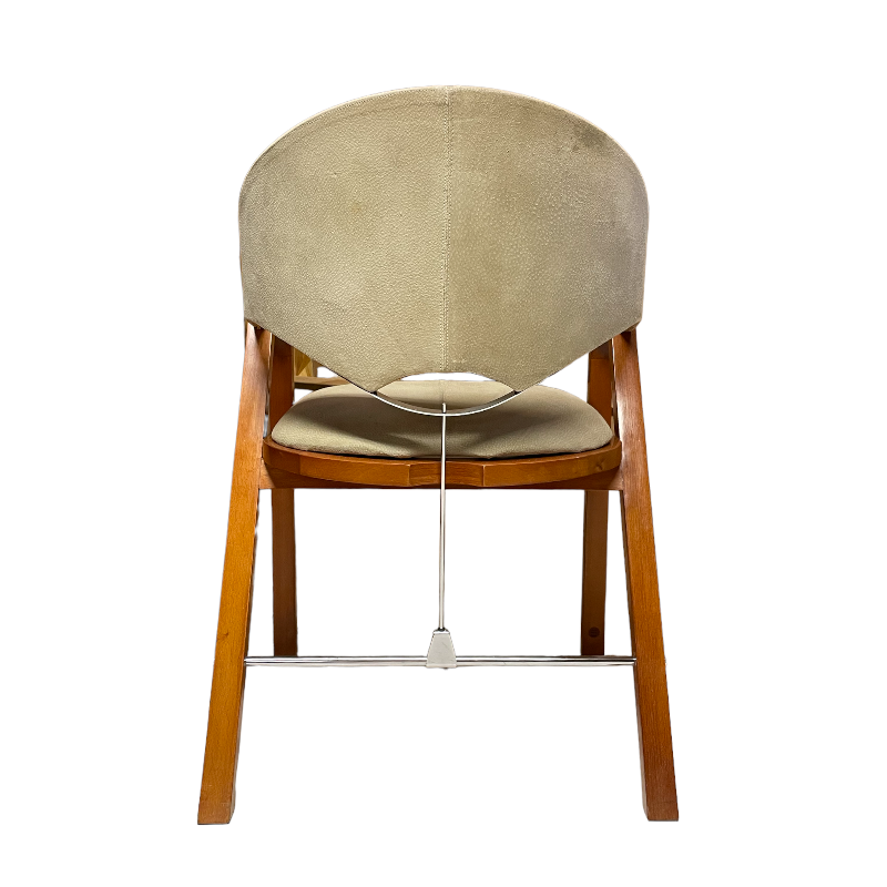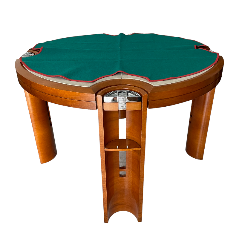 Conjunto Jocker de Jaume Tresserra, mesa de juego en madera cerezo y piel pekari y cuatro sillones en madera, metales cromados y tapicería en piel pekari. España, años 90’.