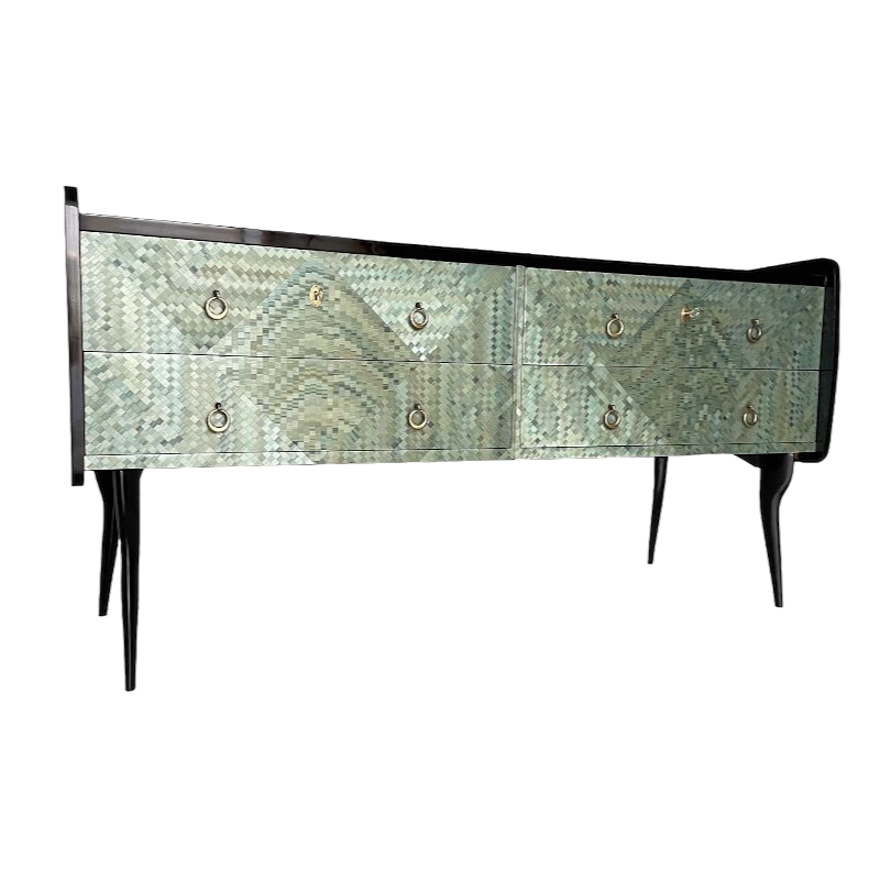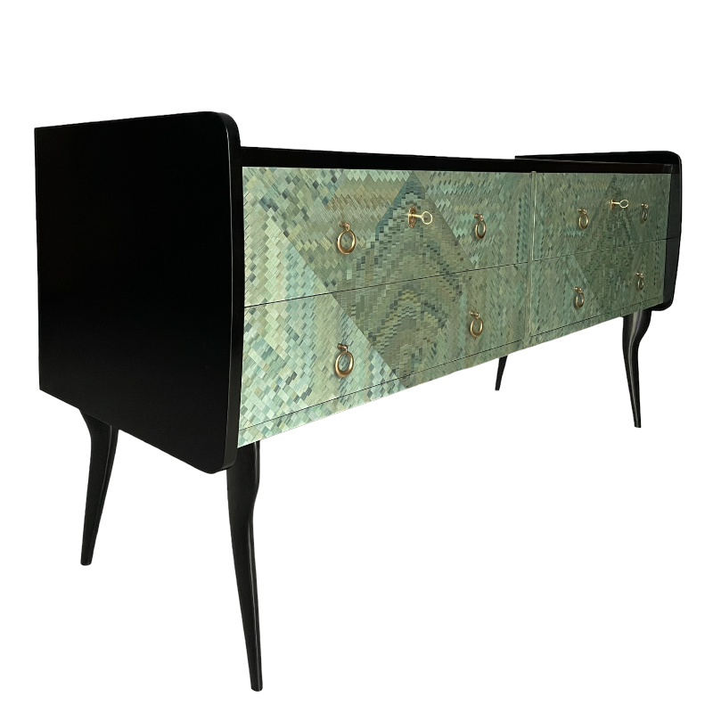 Gran cómoda midcentury en madera lacada y frontales en marquetería de paja. Pieza única intervenida por Atelier D’art J.C.