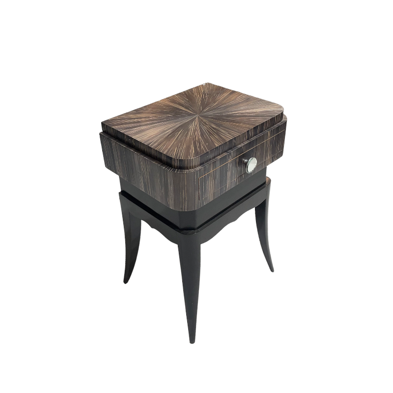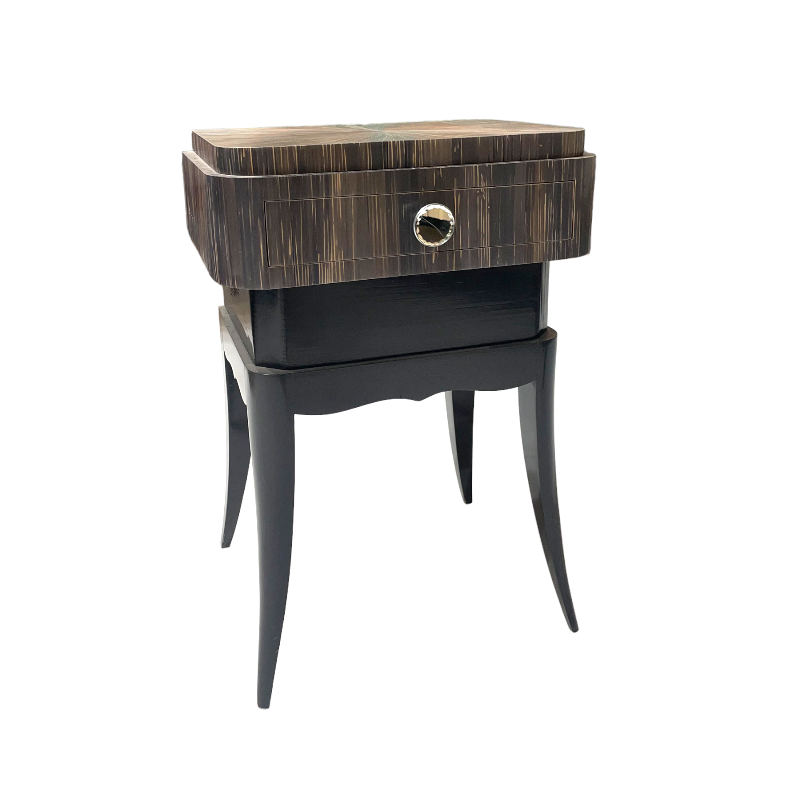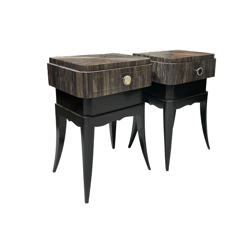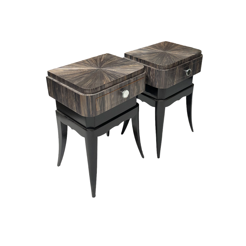 Pareja de mesillas art deco en laca negra y marquetería de paja. Francia, años 30/40’.