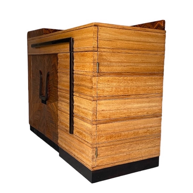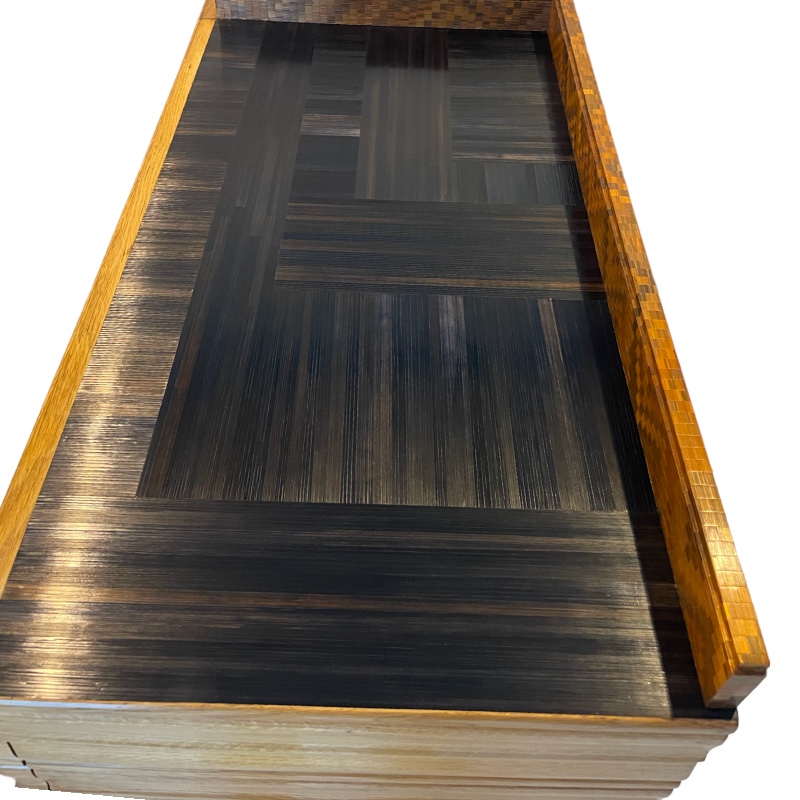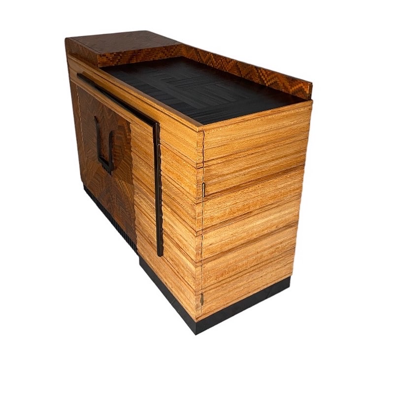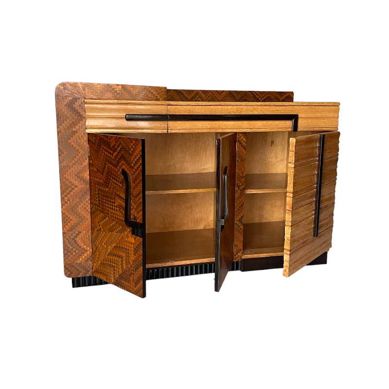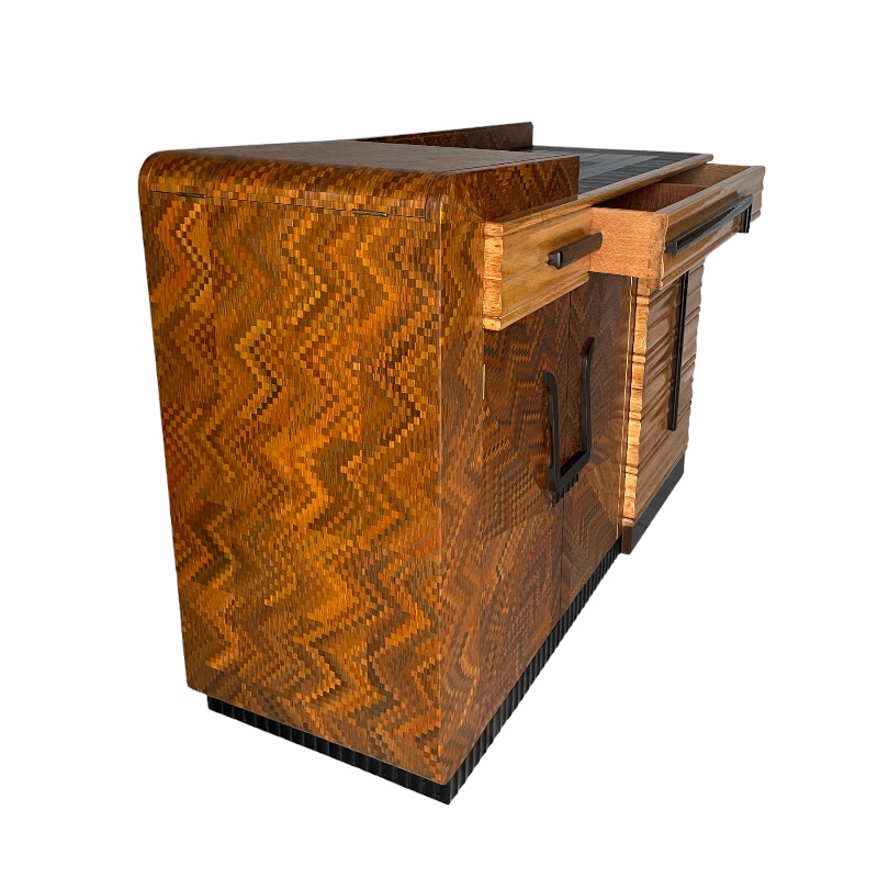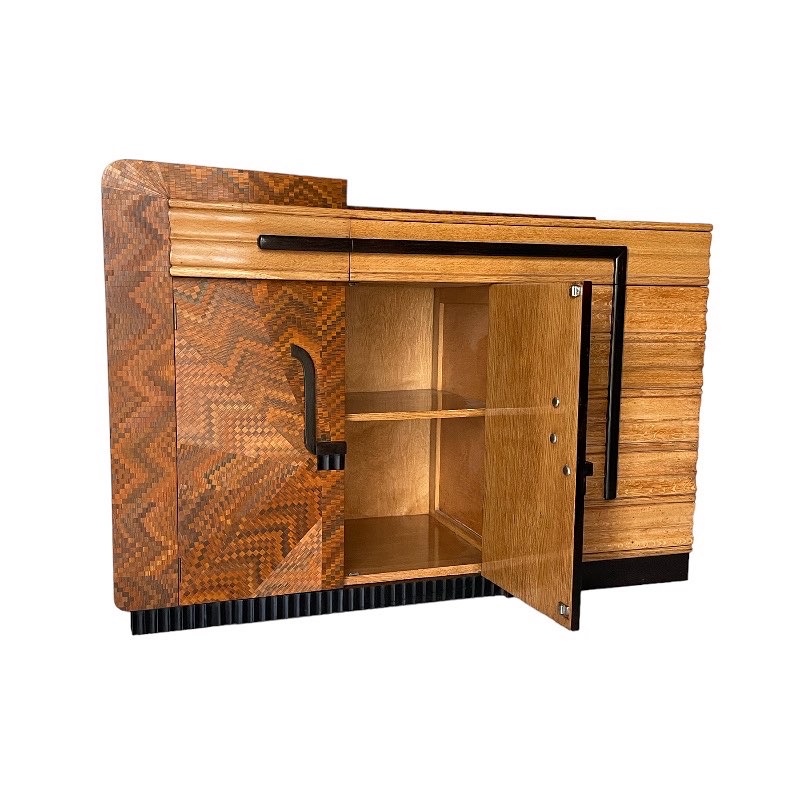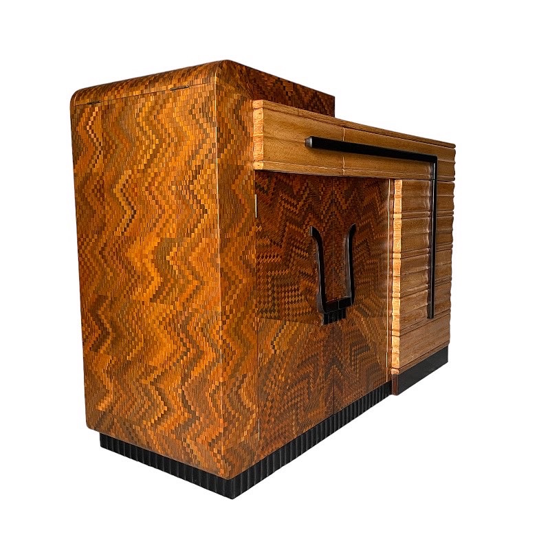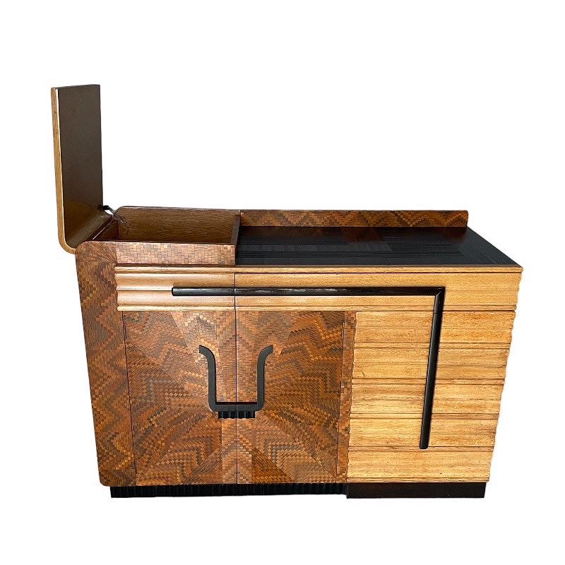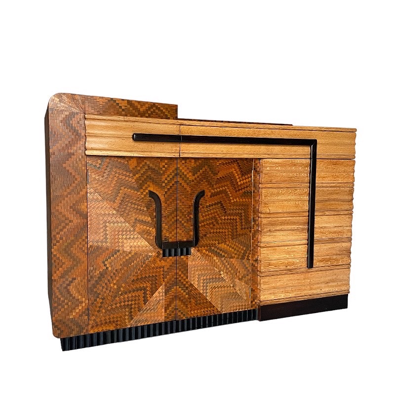 mueble art deco en roble y marquetería de paja efecto piel de anaconda.