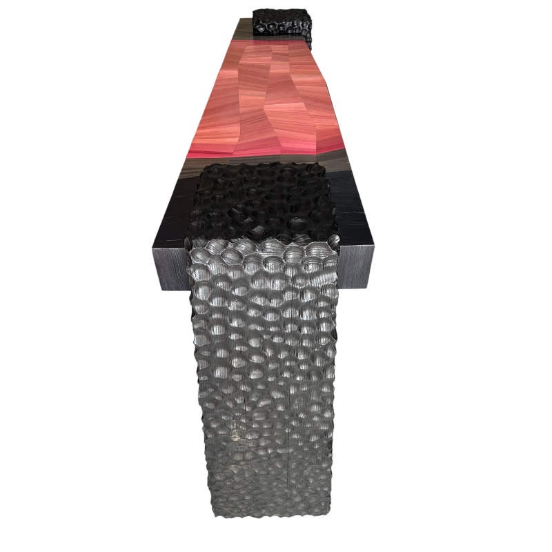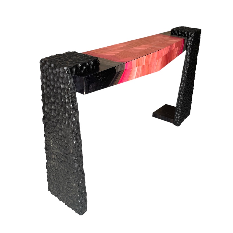 Consola Pau, con patas en madera de fresno tallada y carbonizada con cuerpo de linea asimétrica en marquetería de paja inspirada en la obra de Gaudí, diseño exclusivo de Atelier Dart J.C.