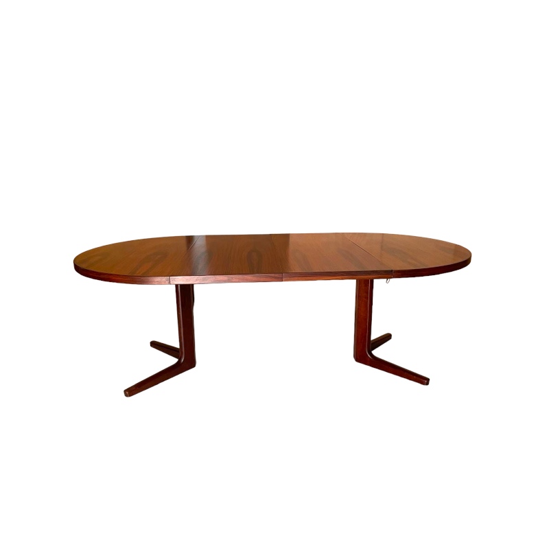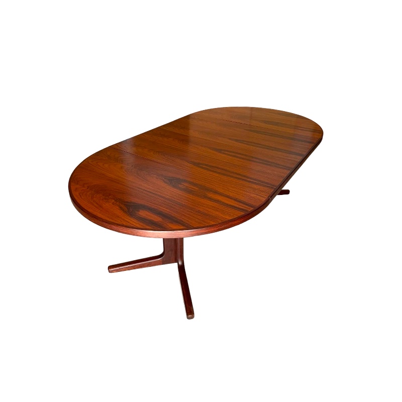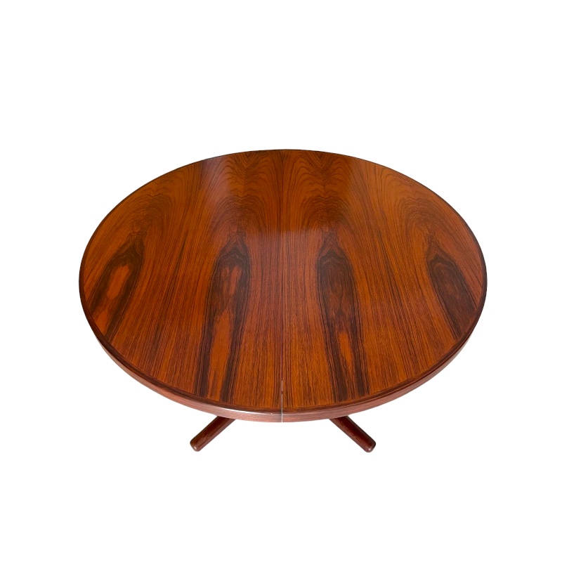 Mesa danesa redonda, extensible, posee dos tableros que la amplian de forma independiente. madera de palisandro, editada por Mobelfabrik. Dinamarca años 60.