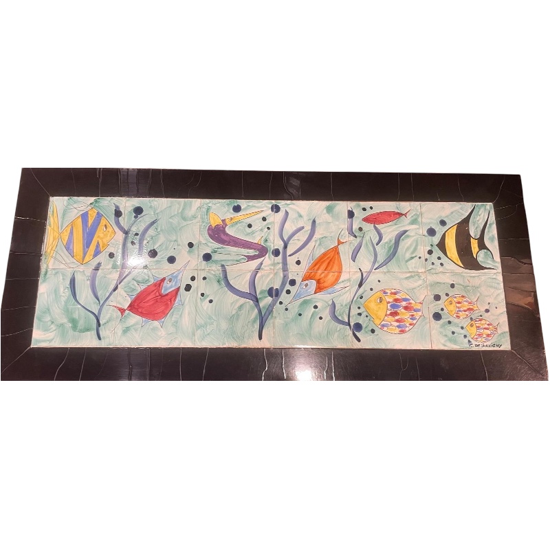 Mesa de centro de cerámica de Vallauris esmaltada pintada a mano y firmada C.de Savigny y latón. Francia años 50’.