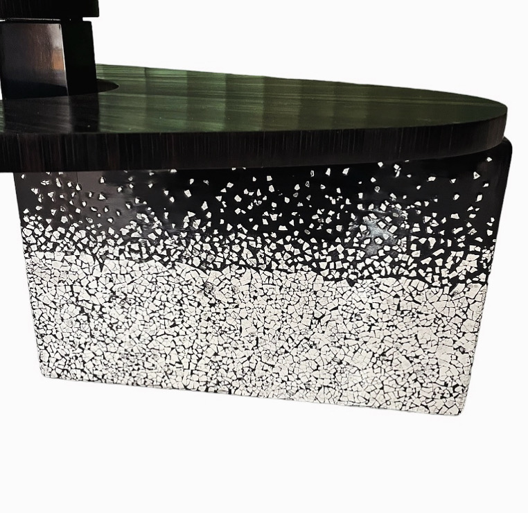 Mesa de centro diseño exclusivo de Atelier Dart J.C. con tapa a dos alturas en marquetería de paja de color negro marrón y tres potentes patas en acabado de laca de cáscara de huevo. Pieza única.