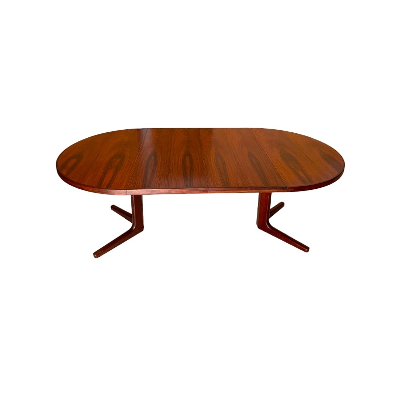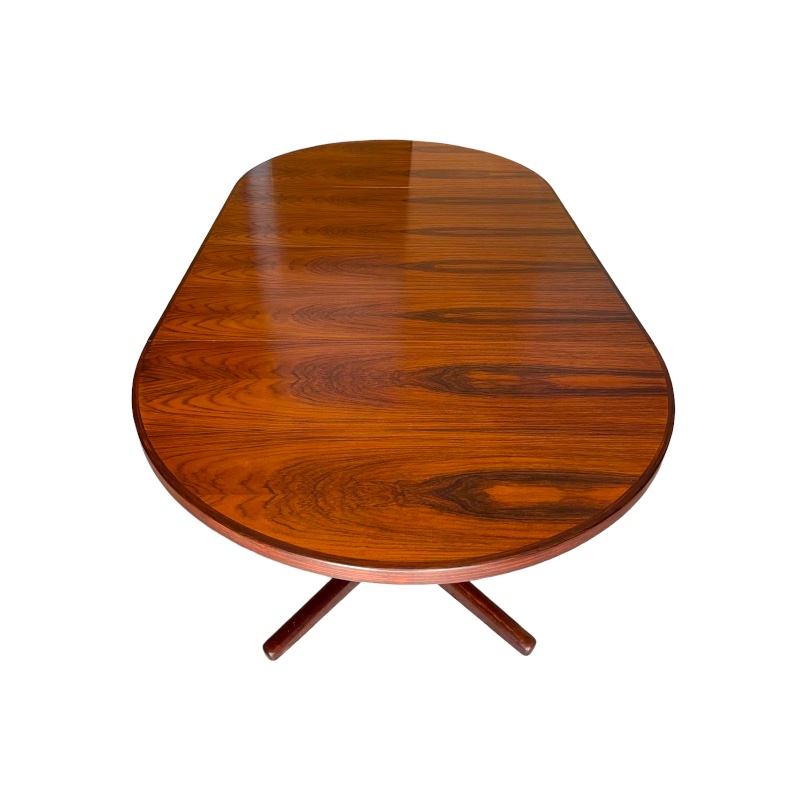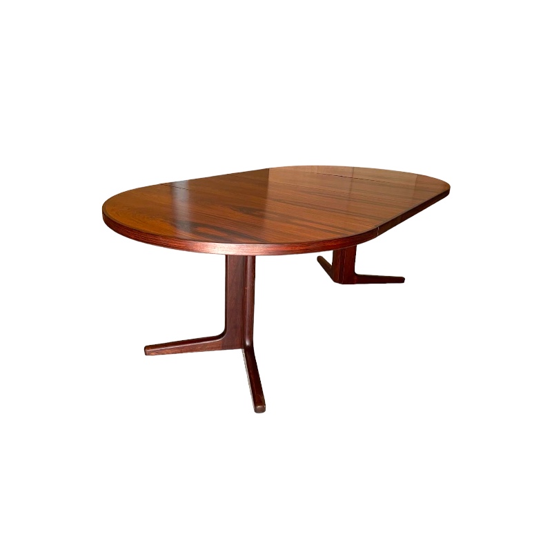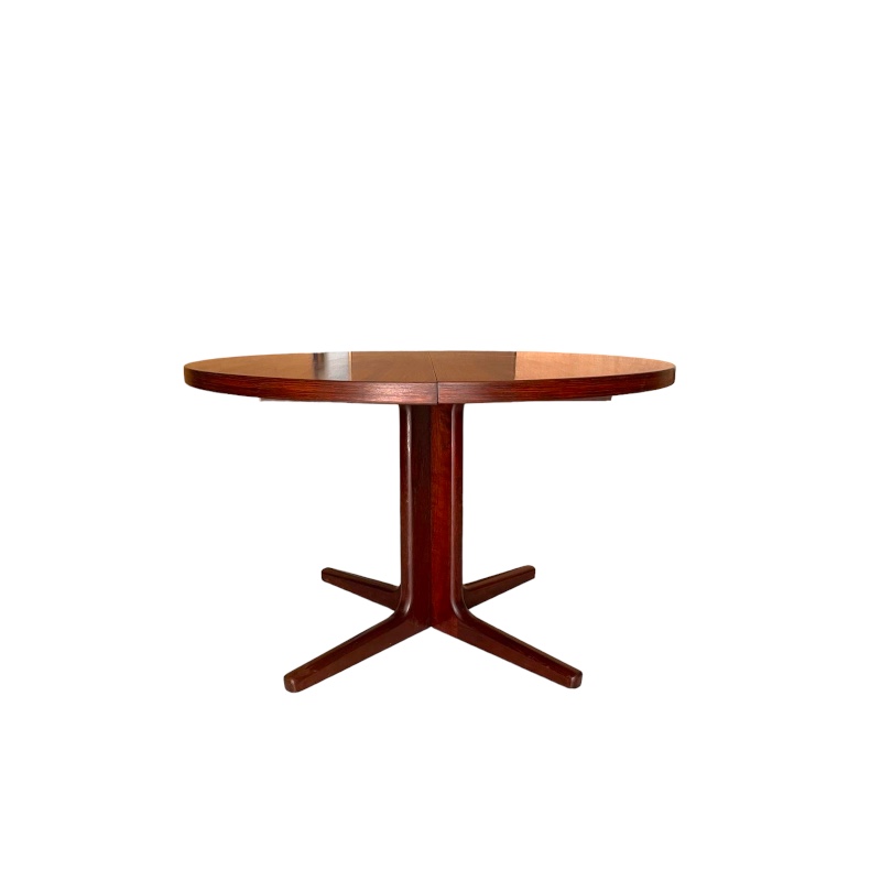 Mesa danesa redonda, extensible, posee dos tableros que la amplian de forma independiente. madera de palisandro, editada por Mobelfabrik. Dinamarca años 60.